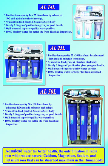We are Manufacturer and Suppliers of R O water purifier machines like Counter Top RO systems, wall mounted R.O. Water Filters, ro with U V technology and added minerals so many other Models of Reverse Osmosis water Purification systems in India. We are introducing a Latest Technology Reverse Osmosis Water Purifier with the proud name of Aqua Lead (Leader in Purity) certified ISO 9001 : 2008 with Trade Mark keeps us away from ordinary cut throat competition with full guarantee and warrantee for complete satisfaction using Branded ro water purification machine.